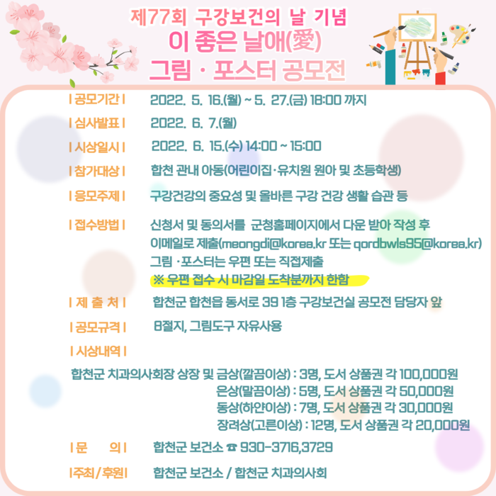 합천군 보건소는 구강보건의 날(6월 9일)을 맞아 ‘이 좋은 날애(愛) 그림·포스터 공모전’을 개최한다.