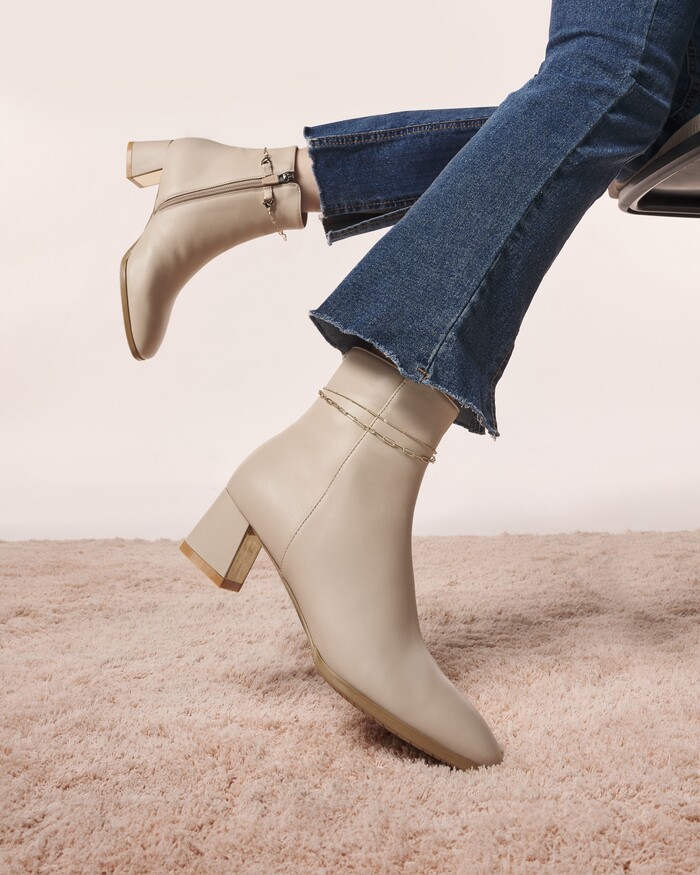 두 번째로 소개할 디자인이 매력적인 ‘포인트 앵클부츠(ALB306)’는 부드러운 질감과 유연성이 뛰어난 양가죽 소재로 제작되어 착용자에게 편안함을 제공하며 양가죽 특유의 통기성으로 발에 쾌적한 환경을 제공한다. 원피 컬러 코팅과 형태감 있는 크리스털 골드 굽의 포인트 디자인은 과하지 않으면서도 눈에 띄는 포인트를 준다. 또한 발목 이중 원 포인트 장식으로 슈즈의 분위기를 더욱 매력적으로 만든다.