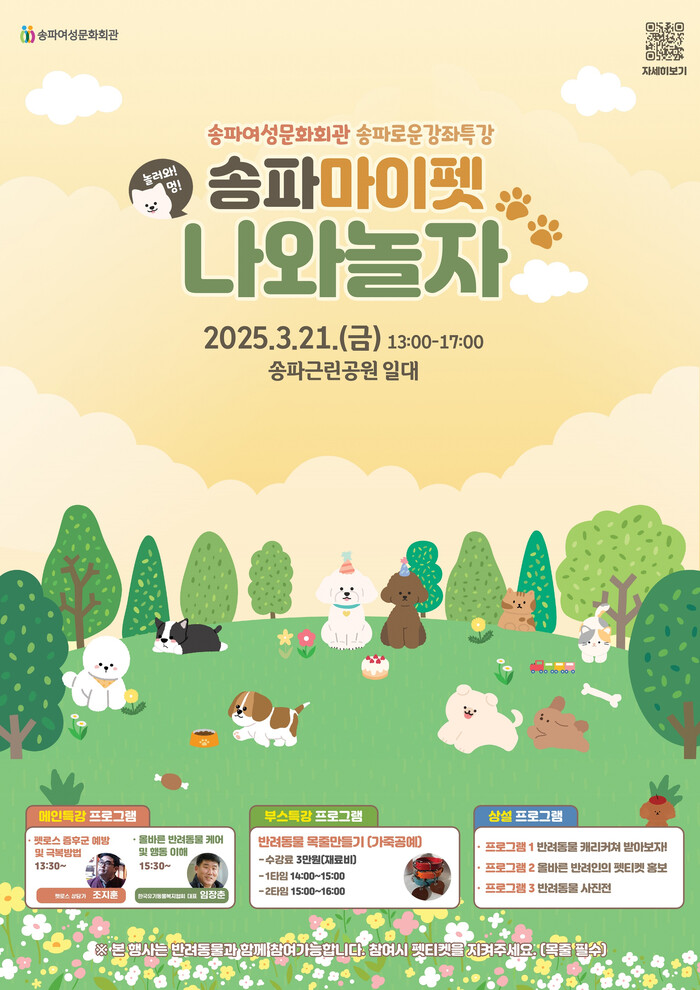 [시민일보 = 이대우 기자] 송파구(구청장 서강석)가 오는 21일 오후 1시 송파여성문화회관 앞 송파근린공원(송파대로42길 29)에서 ‘송파 마이펫 나와 놀자’를 개최한다.