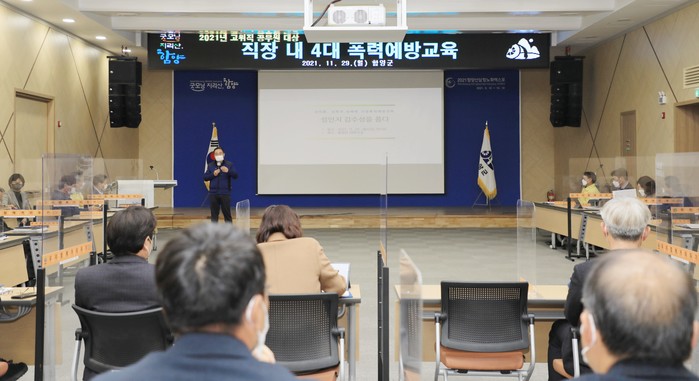함양군은 11월 29일 오전 군청 대회의실에서 서춘수 군수를 포함한 간부공무원 40여 명이 참석한 가운데 전문강사를 초빙해 성희롱·성폭력·가정폭력·성매매 예방교육을 진행했다.