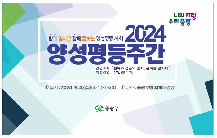 [시민일보 = 여영준 기자] 서울 중랑구(구청장 류경기)가 매년 9월 1일부터 7일까지 진행되는 양성평등주간을 맞이하여 ‘모두의 돌봄, 돌봄을 돌보다’라는 주제로 다채로운 행사를 진행한다.