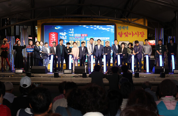 오승록 서울 노원구청장은 지난 21일 석계역 문화공원 일대에서 열린 ‘달빛 야행(夜行)’ 행사에 참석했다. 사진은 오 구청장(오른쪽 열 번째)과 관계자들이 점등식을 진행하는 모습. (사진=노원구청 제공)