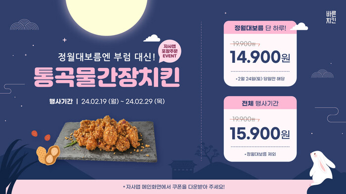 프로모션은 자사앱 방문포장 고객을 대상으로 2월 19일부터 29일까지 진행된다. 시기에 맞춰 부럼 대신 통곡물 토핑이 가득 들어간 ‘통곡물간장치킨’을 정상가인 19,900원에서 4,000원 할인된 15,900원에 먹을 수 있다. 특히, 정월대보름 당일인 2월 24일에는 추가 할인을 적용해 14,900원에 통곡물간장치킨을 즐길 수 있다.