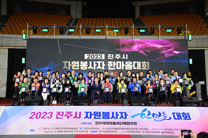 진주시자원봉사단체협의회는 17일 진주실내체육관에서 자원봉사자 2400여 명이 참석한 가운데 ‘2023 진주시 자원봉사자 한마음대회’를 개최했다.