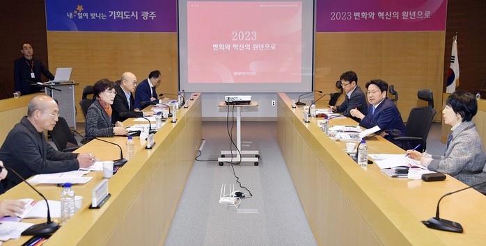 이날 업무보고에는 강기정 시장을 비롯해 송진희 광주디자인진흥원장, 나건 광주디자인비엔날레 총감독 등 10여 명이 참석했다.