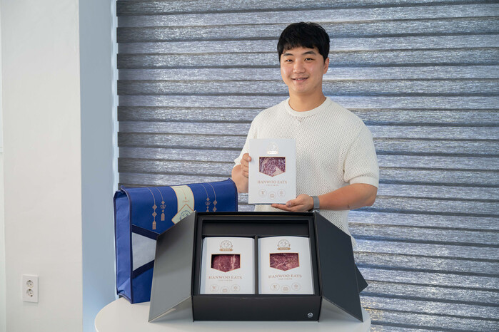 | ▲ 최재환 한우이츠(쿠팡 마켓플레이스 입점 브랜드) 대표가 한우 선물세트와 함께 포즈를 취하고 있다.(사진=쿠팡 제공) |