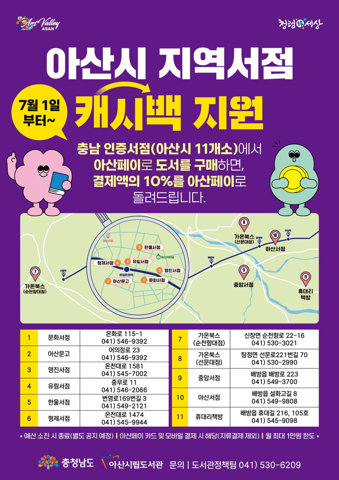 이번 사업은 지역내에 있는 충남 인증서점에서 아산페이로 도서를 구매하면, 결제액의 10%를 구매자에게 돌려주는 사업이다.