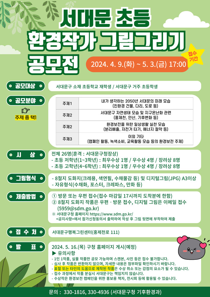 공모에 관한 자세한 내용은 서대문구청 기후환경과(서대문 행복그린센터)로 문의하면 된다.
