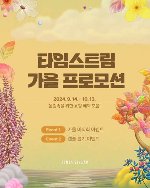 타임스트림 역시 방문객들이 풍성한 혜택으로 즐거운 연휴를 보낼 수 있도록 ‘가을피크닉’ 프로모션을 실시한다. 가을미식회 이벤트는 타임스퀘어 앱 회원 대상으로 진행되며, 앱 내 타임스트림 이벤트 페이지에서 ‘가을미식회’ 쿠폰을 다운로드한 고객에게 타임스트림 F&B매장에서 사용할 수 있는 5천 원 할인쿠폰을 제공한다.