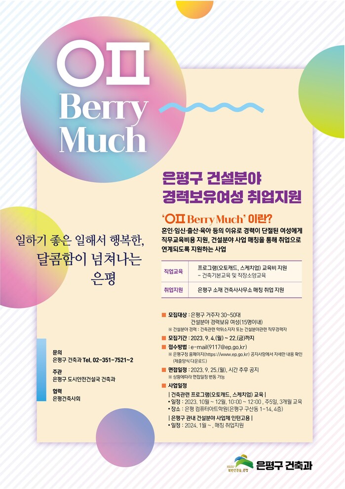 ‘ㅇㅍ Berry Much’란 은평, 달콤한(Berry), 넘쳐나는(Much)의 합성어로 ‘일하기 좋고 일해서 행복한, 달콤함이 넘쳐나는 은평’이라는 의미가 있다. 이는 건설 분야의 경력을 보유하고 있는 전문직 여성들에게 직업교육 비용을 지원해 주고 취업의 기회를 지원하는 사업이다.