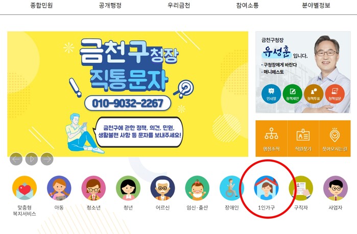 [시민일보 = 여영준 기자] 서울 금천구(구청장 유성훈)는 1인 가구 구민에게 필요한 정책을 안내하기 위해 구청 누리집에 ‘1인 가구’ 메뉴를 신설했다고 8일 밝혔다.