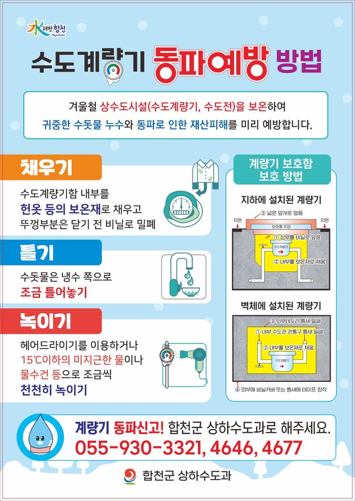 군은 군민들을 대상으로 계량기 동파 예방 안내문 배부, 마을방송 등을 통해 주민 행동요령을 적극 홍보할 계획이다.