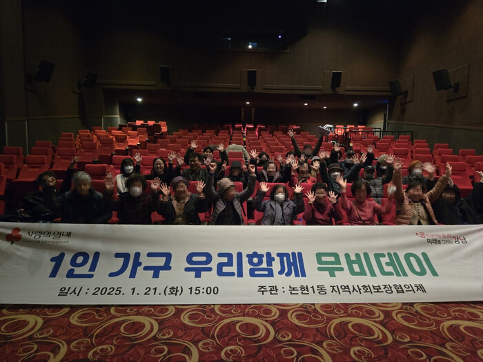 논현1동 지역사회보장협의체가 함께한 이번 행사는 ‘2025 희망온돌 따뜻한 겨울나기’ 행사에 주민들이 기탁한 후원금을 활용했다. 함께 관람한 작품은 안중근 의사의 하얼빈 의거를 소재로 한 ‘하얼빈’으로 3주 이상 국내 박스오피스 1위를 기록하고 있는 화제작이다. 이날 단체관람에는 고립감을 해소하기 위해 대청종합사회복지관 1인가구 프로그램에 참여하고 있는 이들도 함께하며 정서적 안정감과 사회적 유대감을 강화하는 시간을 보냈다.