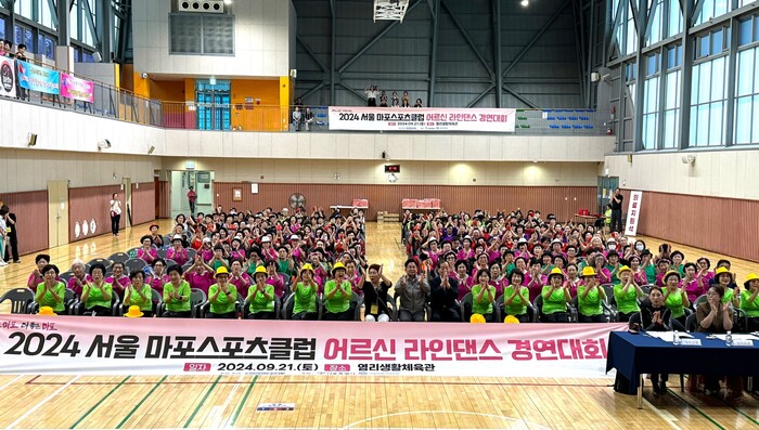 박강수 서울 마포구청장이 지난 21일 염리생활체육관에서 개최된 '어르신 라인댄스 경연대회'에 방문했다. 사진은 대회가 끝난 뒤 박강수 구청장(가운데)과 참가자들이 기념촬영을 하고 있는 모습. (사진=마포구청 제공)