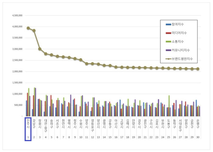 한국기업평판연구소는 지난 9월 30일부터 10월 30일까지 226개 기초자치단체 브랜드 빅데이터를 분석한 결과 1위 진주시, 2위 강남구, 3위 창원시 순으로 분석됐다고 밝혔다.