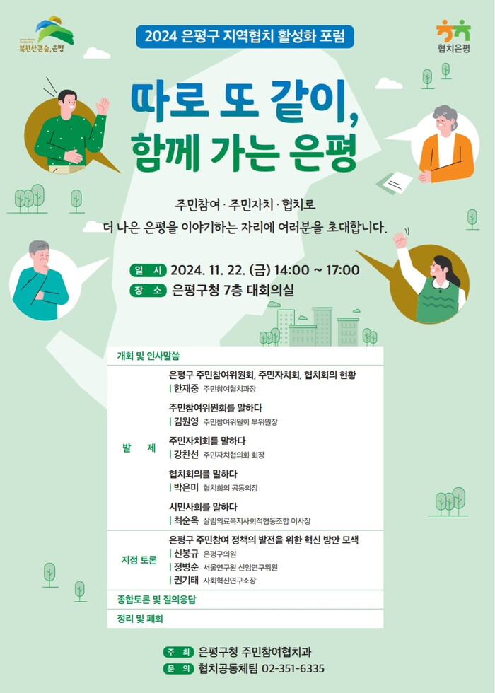[시민일보 = 이대우 기자] 은평구(구청장 김미경)는 ‘2024 은평구 지역협치 활성화 포럼 : 따로 또 같이, 함께 가는 은평’을 오는 22일 개최한다고 밝혔다.