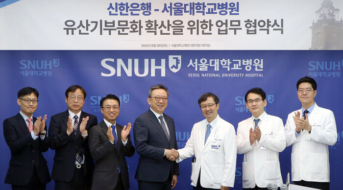 | ▲ 지난 26일 서울시 종로구 소재 서울대학교병원 대한의원 1회의실에서 신탁 활용 유산기부 문화 확산을 위한 업무협약을 체결하고 정상혁 신한은행장(왼쪽 네번째), 김영태 서울대학교병원장(오른쪽 세번째) 및 관계자들이 기념 촬영하는 모습 |