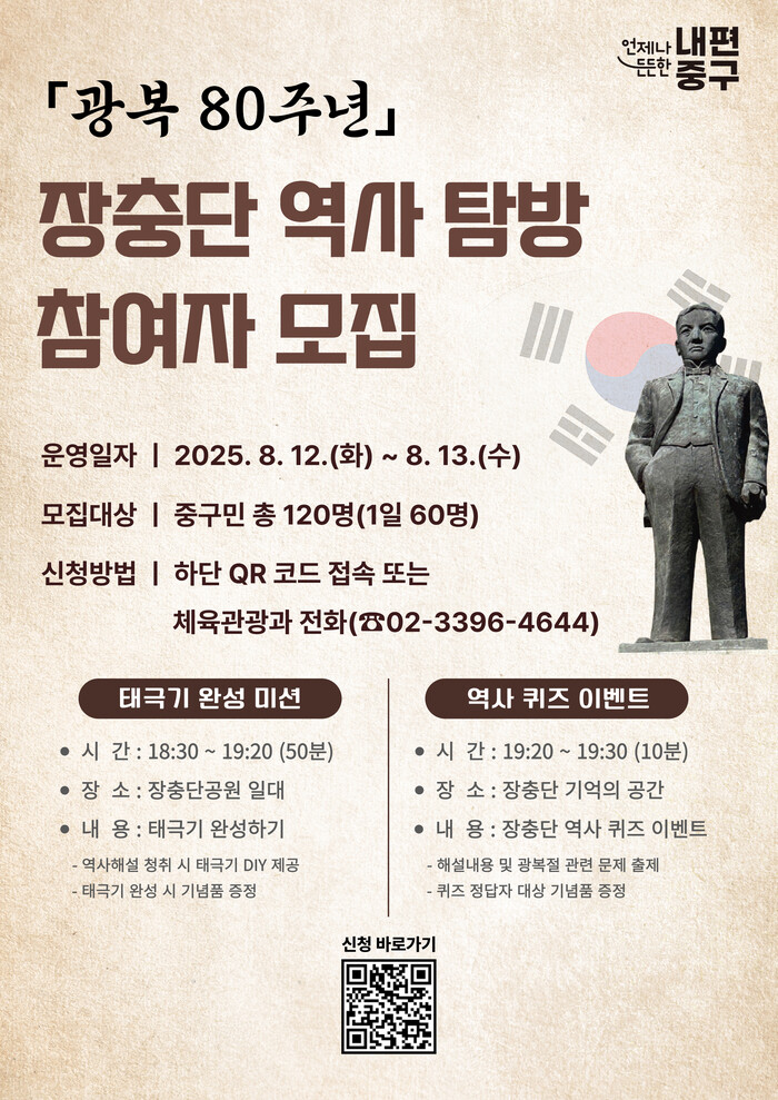 [시민일보 = 여영준 기자] 서울 중구가 광복80주년을 맞아 모든 세대가 함께 참여할 수 있는 역사 탐방 프로그램을 마련했다.