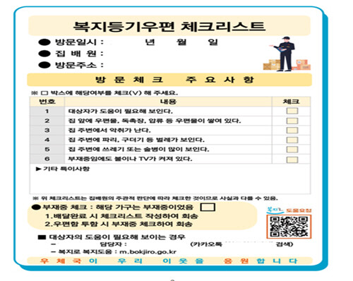 집배원은 우편 전달 시 해당 가구의 주변 환경 및 위기 징후 등을 파악하기 위해 '도움이 필요해 보인다,' '집 앞에 우편물, 독촉장, 압류 등 우편물이 쌓여있다', '술병이 많이 쌓여 있다', '집 주변에서 좋지 않은 냄새가 난다' 등 대상자의 생활실태를 실질적으로 파악할 수 있는 내용의 체크리스트를 작성한다.