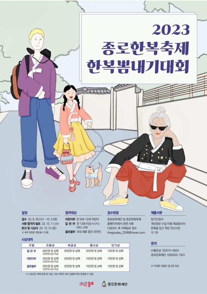 서류 합격자 발표는 10월 11일이 이뤄지며, 10월 21일 종로한복축제를 통해 대면 심사를 열고 최종 수상자를 가릴 예정이다. 수상자에게는 같은 날 시상식 무대에서 상금 및 상패를 수여한다.