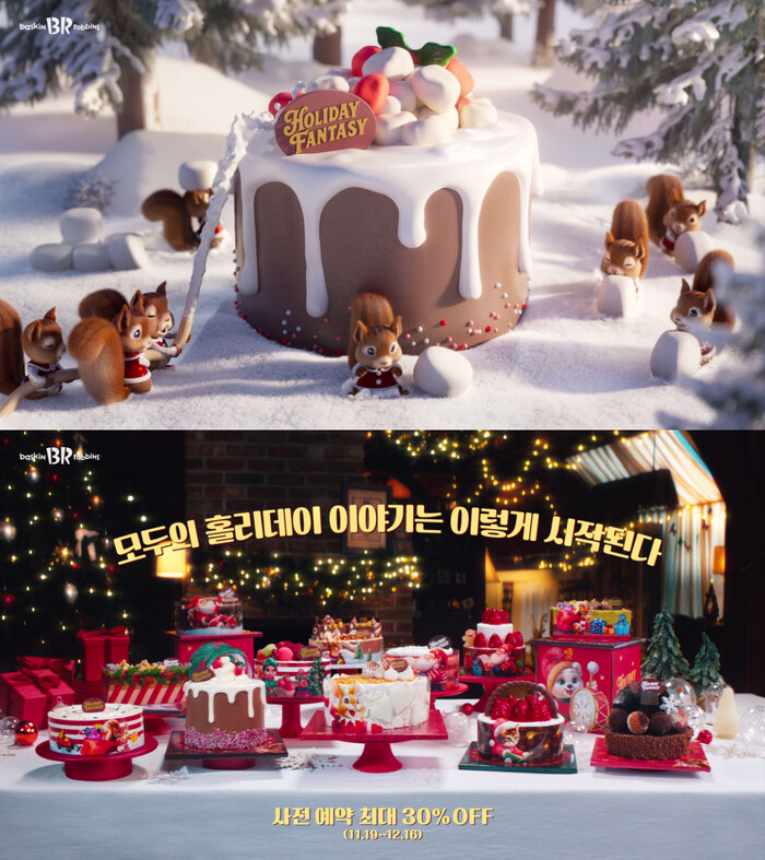 광고는 산타가 아이스크림 케이크 레시피를 연구하는 장면으로 시작한다. 이어 마시멜로우 열매를 모아 케이크를 만드는 다람쥐, 커다란 딸기 장식을 올리는 고양이, 브륄레 케이크 위 스케이팅 공연을 펼치는 토끼가 차례로 등장하며 케이크가 완성되는 과정을 동화적 상상력을 담아 표현했다. 후반부에는 가족이 함께 아이스크림 케이크를 즐기는 모습과 크리스마스 케이크를 전달하러 떠나는 산타와 순록 장면으로 ‘모두의 홀리데이 이야기는 이렇게 시작된다’는 메시지를 전한다. 영상은 배스킨라빈스 공식 유튜브 채널에서 확인할 수 있다.