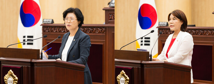 | ▲ 안산시의회가 10일 제298회 임시회 제2차 본회의를 개최해 시정질문과 5분 자유발언을 실시했다. 사진 왼쪽이 이날 시정질문을 실시한 박은경 의원, 오른쪽은 5분 자유발언을 진행한 김유숙 의원의 모습 /사진제공=안산시의회 |
