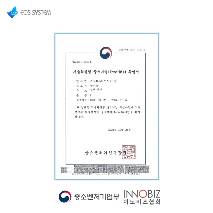 외식업 IT 솔루션 전문 브랜드 ㈜이오스시스템에서 중소기업벤처기업부 주관 ‘기술혁신형 이노비즈(INNOBIZ)’ 인증 기업으로 선정됐다고 23일 밝혔다.