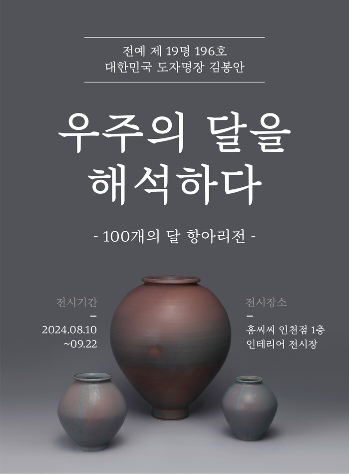 ‘우주의 달을 해석하다-100개의 달항아리 전’이라는 주제로 열리는 이번 전시에서는 전통 청자의 장인으로 손꼽히는 김 명장이 우주의 기운을 담은 달과 인류 문명의 상징인 항아리의 관계성을 독창적인 예술관으로 풀어낸 달항아리 작품 100점이 전시된다.