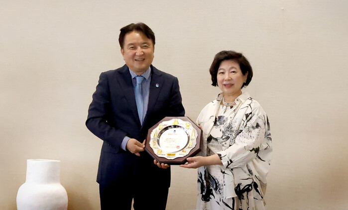 | ▲ 현정은 현대그룹 회장(오른쪽)이 31일 서울 종로구 연지동 현대그룹 사옥 집무실에서 김영환 충북도 도지사(사진 왼쪽)로부터 명예도지사 위촉패를 수여받은 후 기념촬영을 하고 있다. (사진=현대그룹 제공) |