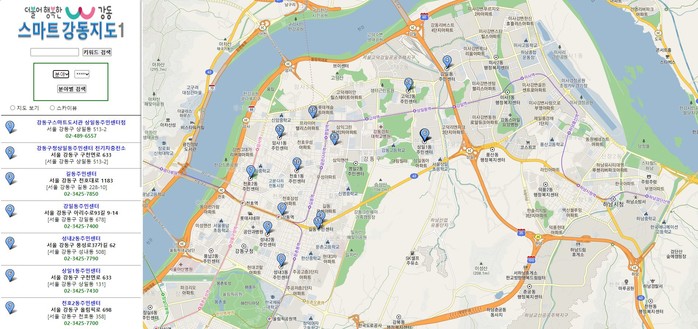 이번 개편에는 구청 직원이 자체 개발한 ‘스마트 강동지도’와 통계청의 통계지리정보서비스(이하 SGIS)를 연계한 ‘SGIS 콘텐츠 지도’ 메뉴가 신설됐다. 간편한 키워드 검색과 분야별 정보를 지도에 표시된 시각 자료로 제공해 이해도와 활용도를 높였다.