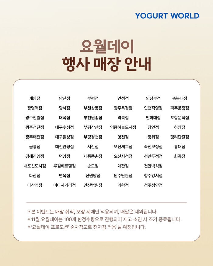 요거트월드는 10월보다 더 많은 매장에서 '요월데이'를 진행하며, 행사 기간 동안 매장 방문 또는 포장하는 모든 고객에게 할인 혜택을 제공한다. 또한, 요거트월드 공식 SNS 채널에서는 다양한 이벤트를 진행하여 많은 관심을 이끌어내고 있다.