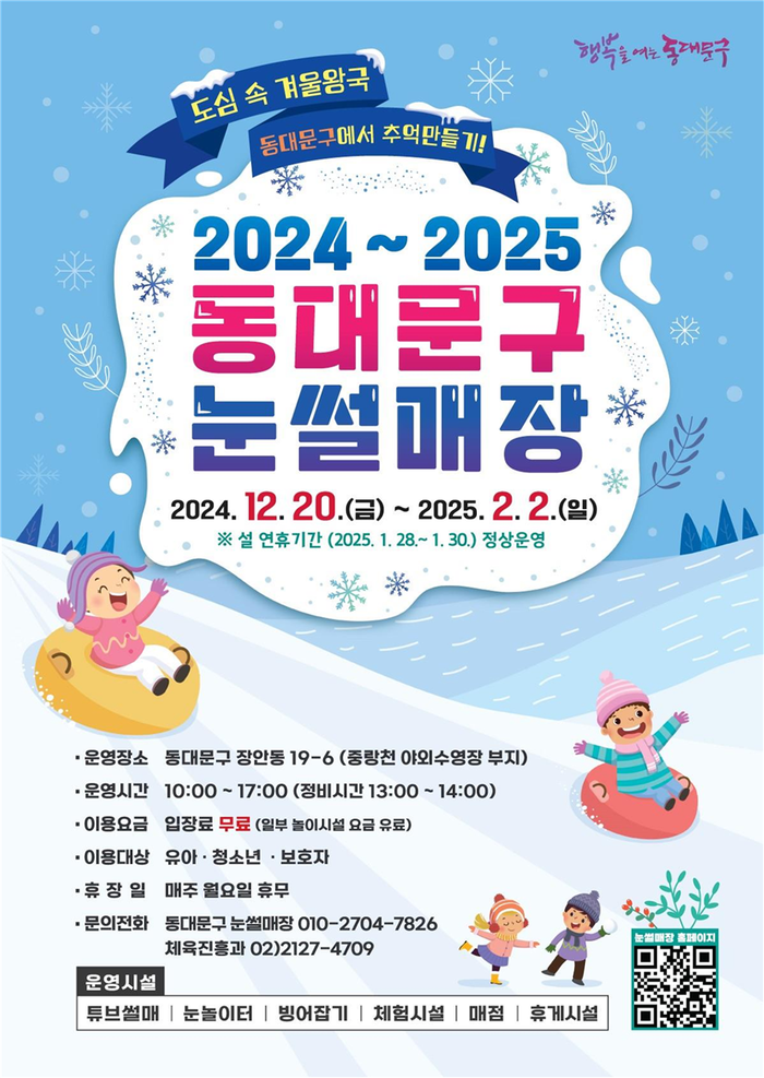[시민일보 = 이대우 기자] 동대문구(구청장 이필형)가 오는 12월 20일(금)부터 중랑천 야외수영장 부지(장안동 19-6)일대에서 눈썰매장을 운영한다.