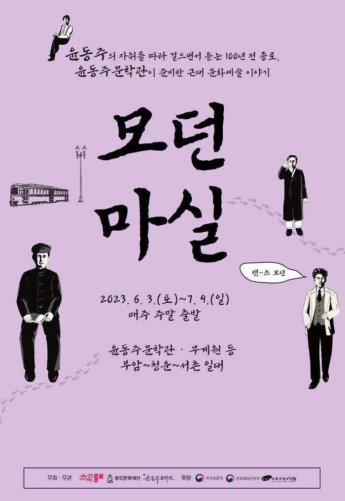 [시민일보 = 이대우 기자] 종로구(구청장 정문헌)가 오는 7월9일까지 매주 주말 근대문화예술사를 돌아보는 특별한 도보여행 프로그램인 ‘2023 윤동주문학관 근대문화투어-모던마실’을 운영한다.