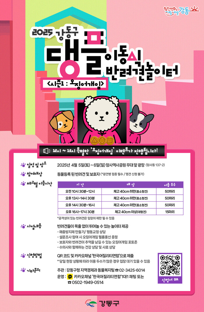 ‘오징어개임’ 참여를 원하는 보호자는 오는 20일 오전 9시부터 ‘댕플’ QR코드나 카카오채널 ‘한국어질리티연합’을 통해 사전 신청할 수 있고, 접수는 선착순 마감된다. 이외 자세한 사항은 강동구청 누리집(홈페이지)을 통해 확인하거나 지역경제과로 문의하면 된다.