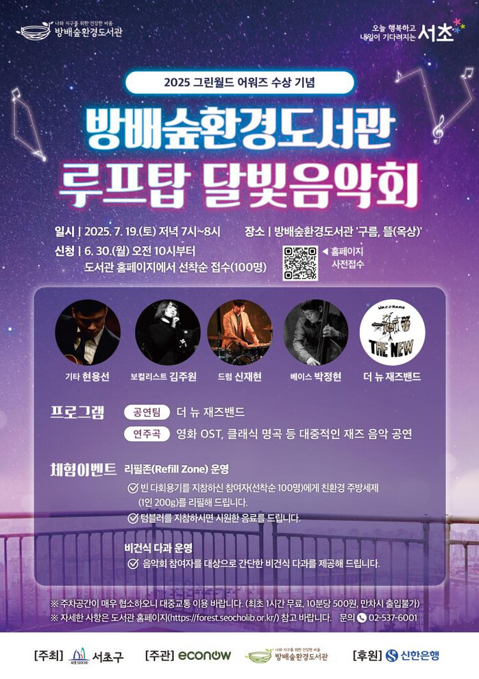 ‘루프탑 달빛음악회’는 도서관 옥상 잔디밭에서 열리며 오후 7시부터 8시까지 ‘한여름 밤의 재즈 음악회’ 형식으로 진행된다. 숲 속 자연과 어우러진 공간에서 영화 OST와 팝 명곡 등 대중적인 재즈 음악이 연주되며, 전 연령층이 함께 즐길 수 있도록 구성된다. 현장에서는 비건 다과도 제공될 예정이다.