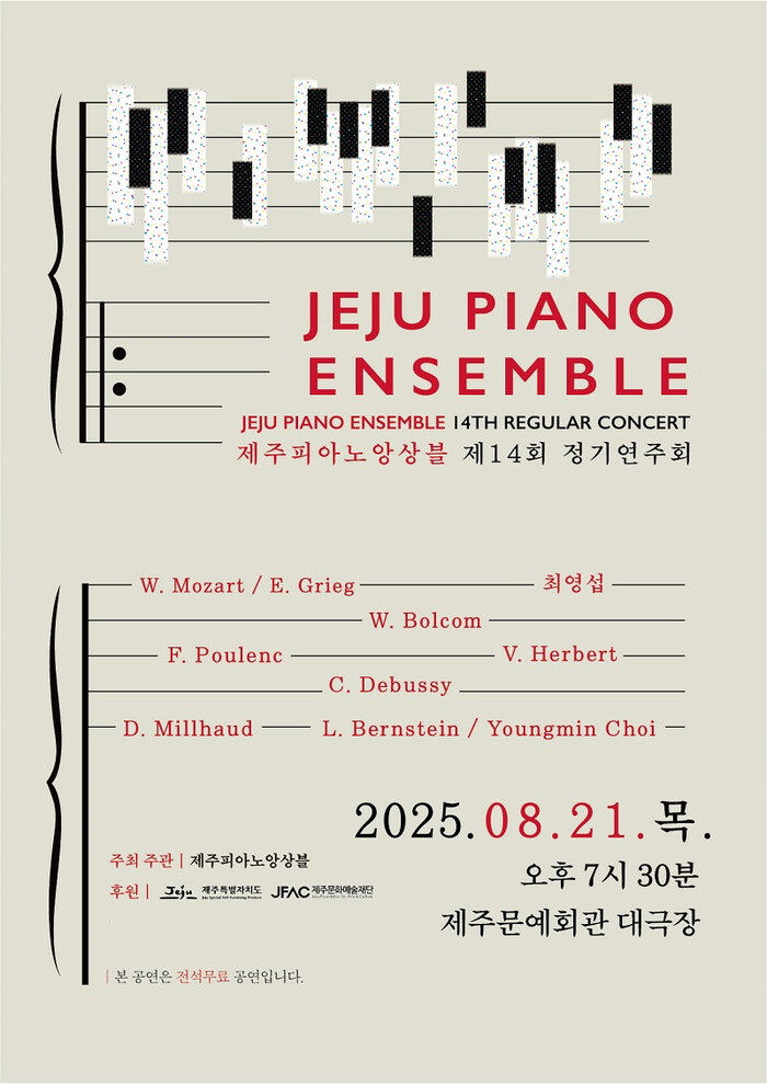 제주피아노앙상블은 1998년 창단 이후 다양한 앙상블 무대를 통해 클래식 대중화와 제주 음악 문화 발전에 기여해 왔다. 특히 이번 공연은 모차르트와 드뷔시의 섬세한 감수성, 번스타인의 에너지 넘치는 선율, 그리고 현대적 감각이 담긴 국내 작곡가 작품까지 한자리에서 감상할 수 있는 기회다. 본 공연은 전석 무료로 진행된다.