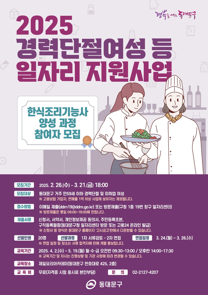 [시민일보 = 이대우 기자] 동대문구(구청장 이필형)는 경력 단절 및 미취업 여성을 대상으로 한식조리기능사 양성 과정 교육생을 모집한다.