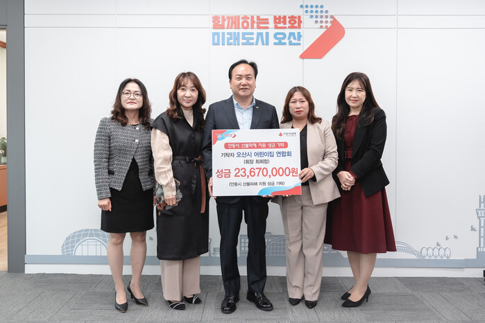 경기 오산시 어린이집연합회가 최근 자매도시인 경북 안동시의 산불 피해 복구를 돕기 위해 성금 2367만원을 기탁했다. 기탁된 성금은 ‘고향사랑 기부 경북 안동 산불 긴급 모금’과 경북사회복지공동모금회를 통해 전달될 예정이다. 사진은 기탁식에서 이권재 시장(가운데)이 관계자들과 기념 촬영을 하는 모습. (사진=오산시청 제공)