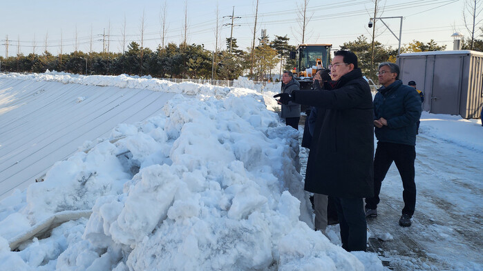 충남 서산시가 지곡면 오토밸리 산업 폐기물 매립장 에어돔의 손상 복구에 대한 관리·감독에 총력을 기울인다. 지난 29일 기록적인 폭설과 강풍으로 인해 해당 산업 폐기물 매립장의 에어돔이 일부 손상되는 사고가 발생했다. 사진은 이완섭 서산시장이 30일 지곡면 오토밸리 산업 폐기물 매립장에 방문해 시설물을 점검하는 모습. (사진=서산시청 제공)