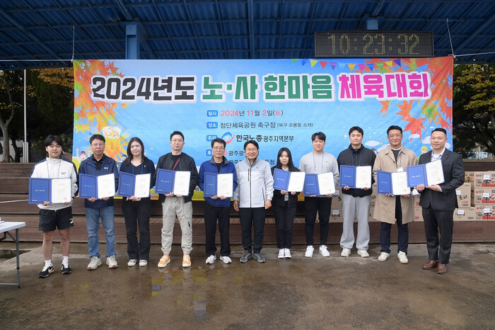 강기정 광주광역시장(가운데)이 지난 2일 오전 첨단체육공원 축구장에서 열린 2024 한국노총 광주지역본부 노사 한마음 체육대회에 참석해 모범조합원 표창을 한 후 기념촬영을 하고 있다. /광주광역시 제공