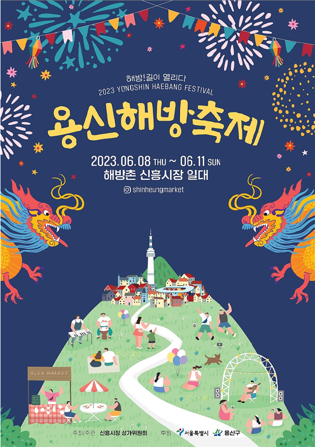 용신해방축제는 코로나19 등으로 주춤했던 해방촌과 신흥시장 상권 활성화를 위해 기획된 축제로, 서울시 주관 '2023년 지역상권 활성화 사업'에 선정돼 사업비 5000만원을 확보한 신흥시장 상가위원회가 주최하고 시와 구가 후원한다.