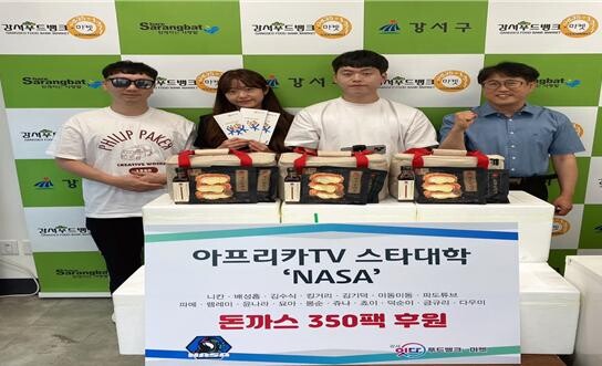 강서푸드뱅크마켓은 지난 7일 아프리카TV 스타대학 ‘NASA’(니칸, 배성흠, 김수식, 킹거리, 김기덕, 미동미동, 파도튜브, 파메, 렘레미, 윤나라, 묘아, 몽순, 쥬나, 쵸이, 덕순이, 금규리, 다우미)를 통해 돈까스 350팩의 기부 물품을 전달받았다고 밝혔다.