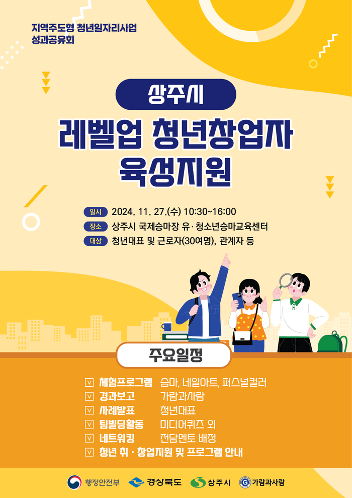 오전 9시 30분부터 이루어지는 성과공유회 1부 행사는 레벨업 청년창업자 육성지원사업과 관련된 청년대표들과 함께 상주시가 자랑하는 승마콘텐츠 체험과 네일아트, 퍼스널 컬러 등 체험프로그램이 이루어진다.