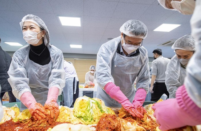 서울 용산구 한남동 주민센터에서는 지난 9일 2021 지구촌 가족과 함께하는 김장 담그기에 나섰다. 김장 담그기에는 중국·일본 등 9개 나라 외국인·다문화 가족 25명이 참석해 김치 담그는 방법을 배운 뒤 김치를 버무렸다. 사진은 성장현 구청장(왼쪽 두 번째)이 김장 버무리기를 하고 있는 모습. (사진제공=용산구청)