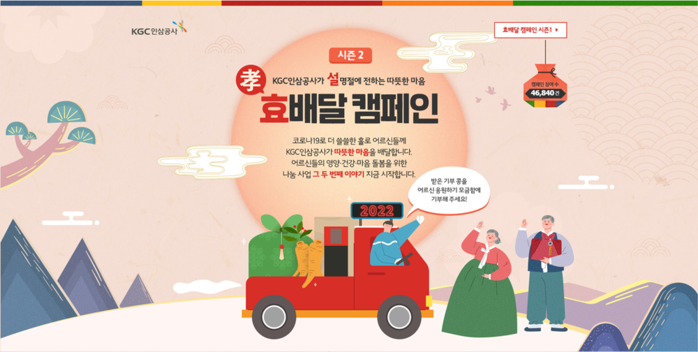 [시민일보 = 이대우 기자] KGC인삼공사가 설을 맞아 홀로 계신 어르신을 위한 나눔 사업인 ‘효(孝) 배달’ 캠페인을 진행한다. 작년 추석에 이어 두 번째로 진행되는 이번 캠페인은 '효(孝) 배달 시즌 2'로 KGC인삼공사와 대한적십자사가 함께한다.