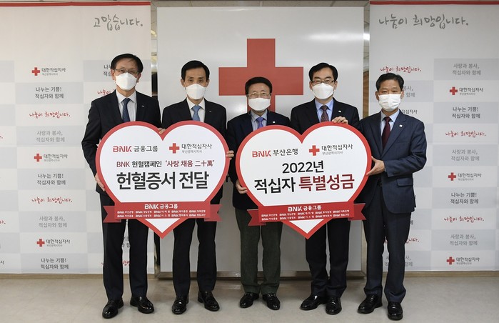 특별성금과 더불어 2021년 한 해동안 진행된 BNK금융그룹 임직원 헌혈 캠페인 ‘사랑나눔 二十萬(이십만)’을 통해 모아진 헌혈증서 600여장을 함께 전달하며 지역 온정 나눔에 손길을 더했다.