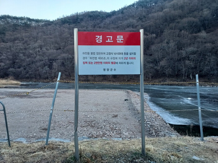 이곳 행사장에 설치된 하천점용 경고문에는 하천을 불법점유하여 고정식 낚시좌대 등 설치할 경우 하천법 제95조의 규정에 2년 이하의 징역 또는 2천만원 이하의 벌금에 처한다라고 영양군수의 경고문이 게시되어 있다.
