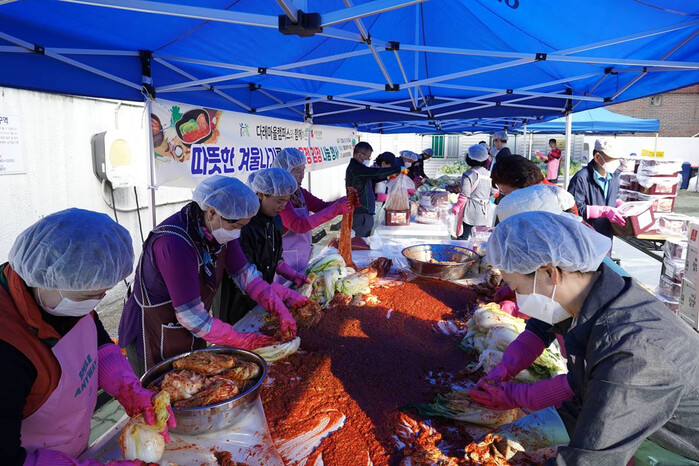 주민자치위원과 통장 등 직능단체 30여 명이 참여해 1천 포기를 김장해 10kg씩 250통을 만들었으며, 관내 취약계층과 경로당 등에 전달했다.