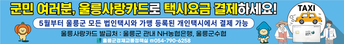 남한권 군수는 “이번 서비스를 통해 고유가와 물가 상승으로 어려움을 겪고 있는 택시 업계와 군민들에게 조금이나마 도움이 될 수 있기를 바란다”며 “앞으로도 울릉사랑상품권의 이용 편의성을 높여 지역경제 회복 및 군민 복리 증진을 위해 최선을 다하겠다”고 말했다.