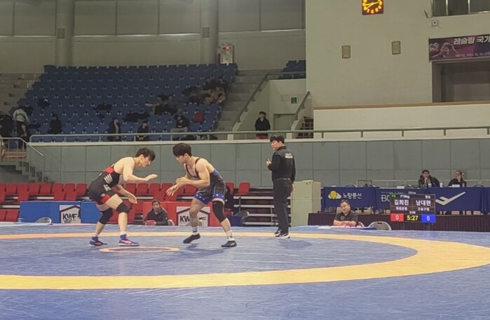 | ▲ 태백고원체육관에서 열린 제17회 전국레슬링종합선수권 대회에 출전한 남대현(사진 오른쪽, 청)이 경기를 펼치고 있다. (사진=구로구청 제공) |